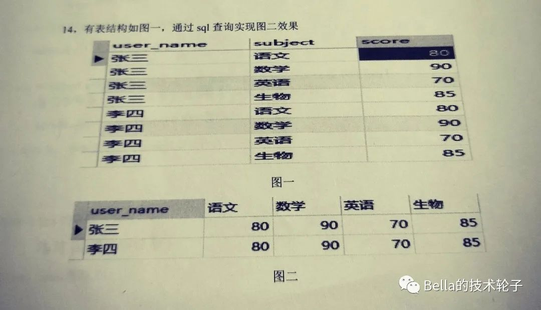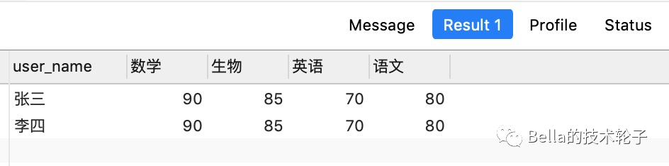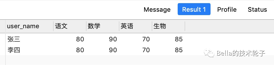 (5,"李四","语文",80),(6,"李四","数学",90),(7,"李四","英语",70),(8,"李四","生物",85);-END-