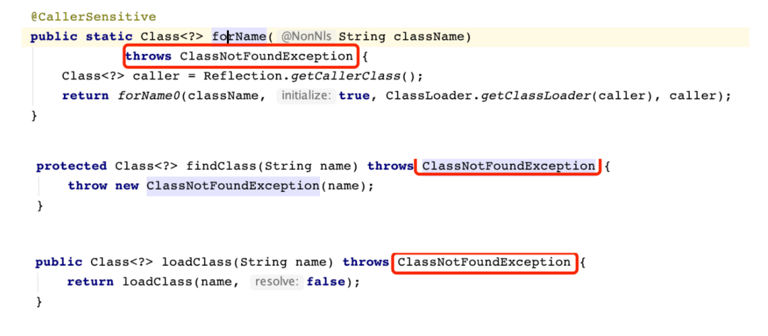 调用 Class.forName()、ClassLoader.findClass() 和 ClassLoader.loadClass() 等方法时可能会引起