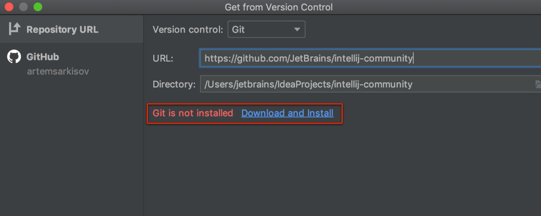 在 IntelliJ IDEA 2020.1 中,使用者无需再事先手动安装好 Git。当克隆一个 Git 仓库时,IDE 会在机器中寻找 Git 可执行文件,若找不到,则会提供下载并进行设置。
