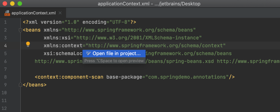 LightEdit 模式允许使用者在类文本编辑器的窗口中对独立文件进行快速修改,而无需创建或加载项目。可通过命令行、IDE 的欢迎界面或操作系统的文件管理器使用 LightEdit 模式开文件。使用“Open File in Project”意图(Alt+Enter)可从 LightEdit 模式切换到完整模式。