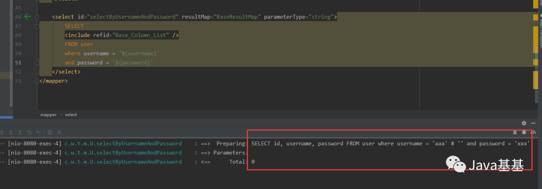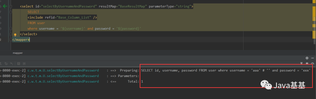 将where条件后的username = '${username}'和and password = '${password}'置为同一行