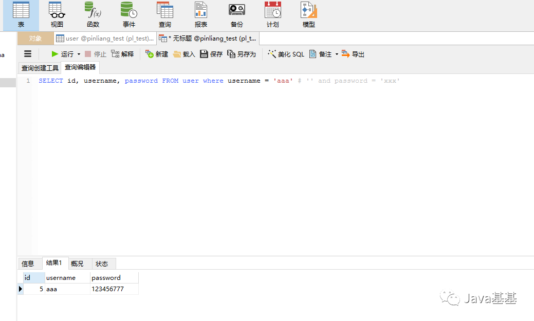 SELECT id, username, password FROM user where username = 'aaa' # ''