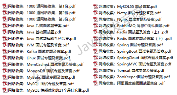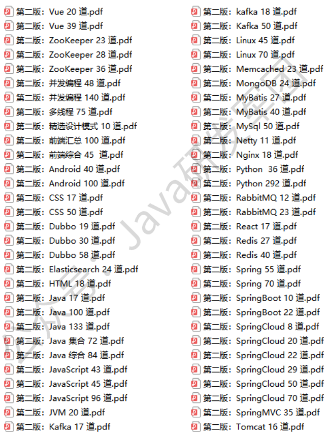 包括 Java 集合、JVM、多线程、并发编程、设计模式、Spring全家桶、Java、MyBatis、ZooKeeper、Dubbo、Elasticsearch、Memcached、MongoDB、Redis、MySQL、RabbitMQ、Kafka、Linux、Netty、Tomcat、Python、HTML、CSS、Vue、React、JavaScript、Android 大数据、阿里巴巴等大厂面试题等、等技术栈!