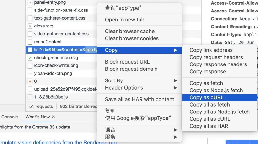 小技巧:我们在Chrome浏览器调试的时候,可以把请求的信息复制为curl格式的。