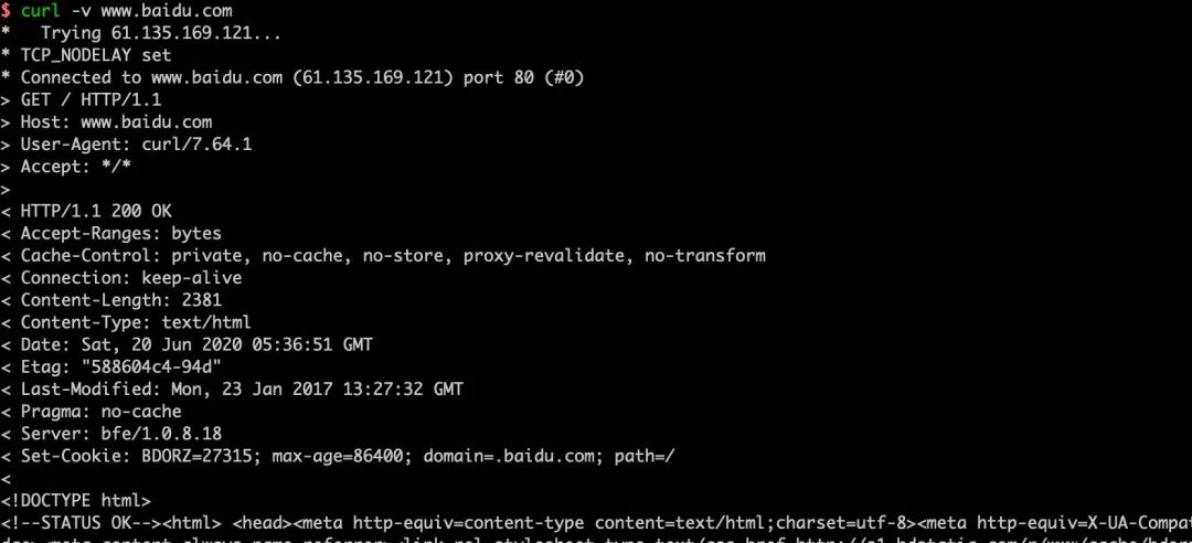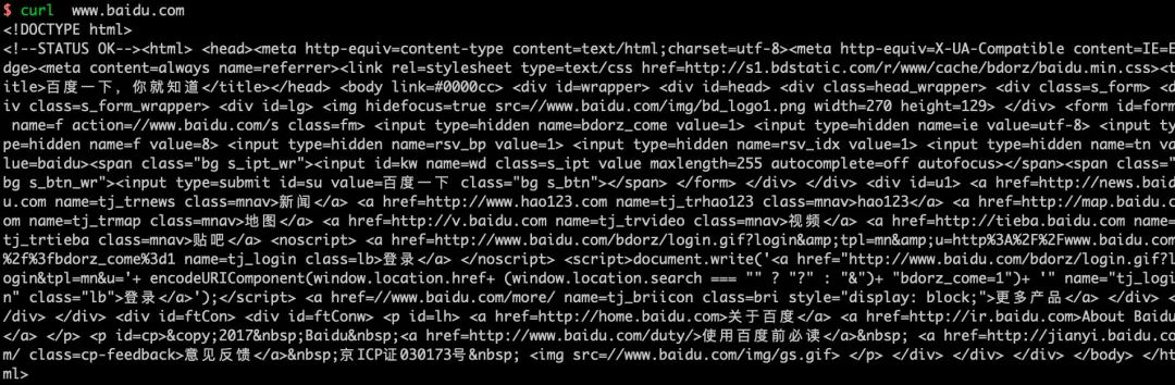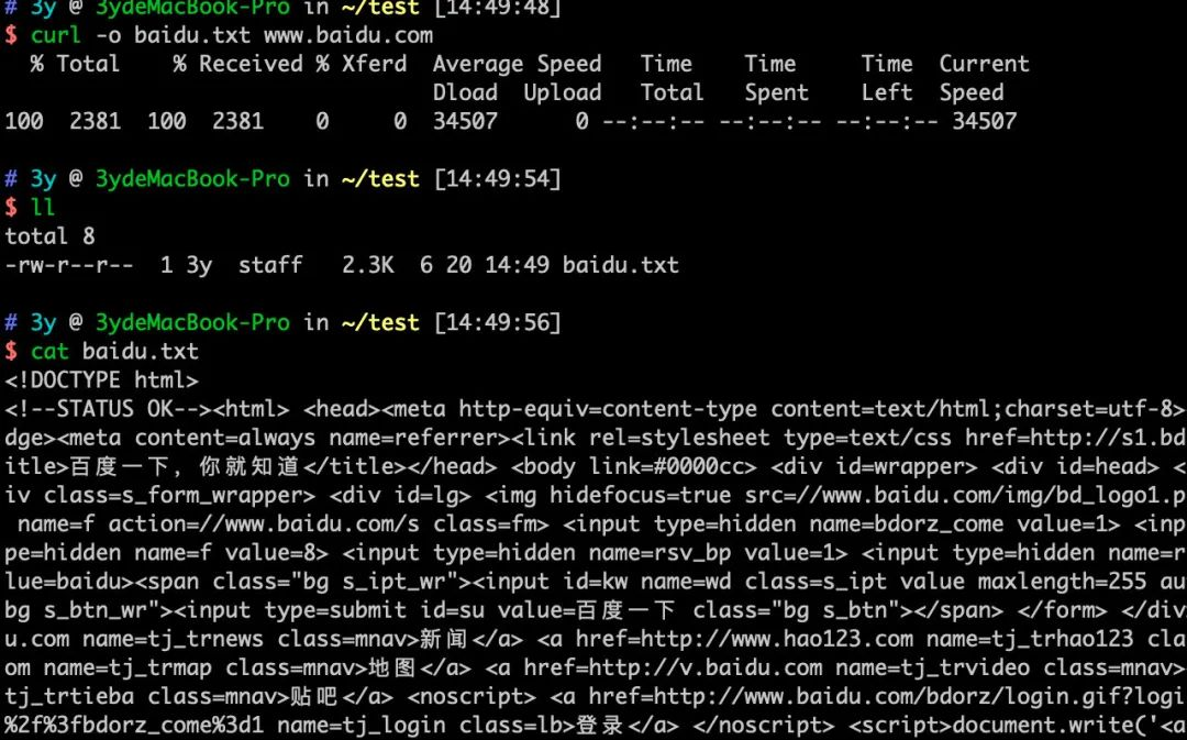 curl是一个请求的工具,服务端返回的文件也是可以下载的。我们通过-o来下载百度返回的HTML