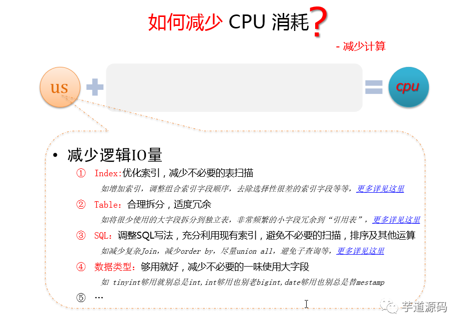 index,优化索引,减少不必要的表扫描 如增加索引,调整组合索引字段顺序,去除选择性很差的索引字段等等