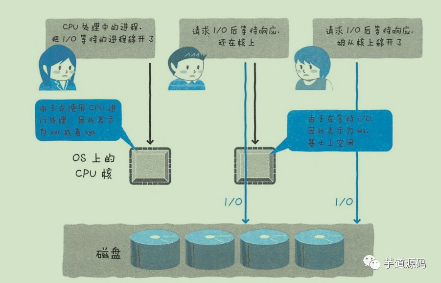 如vmstat中的wa 很高。但IO等待增加,wa也不一定会上升(请求I/O后等待响应,但进程从核上移开了)