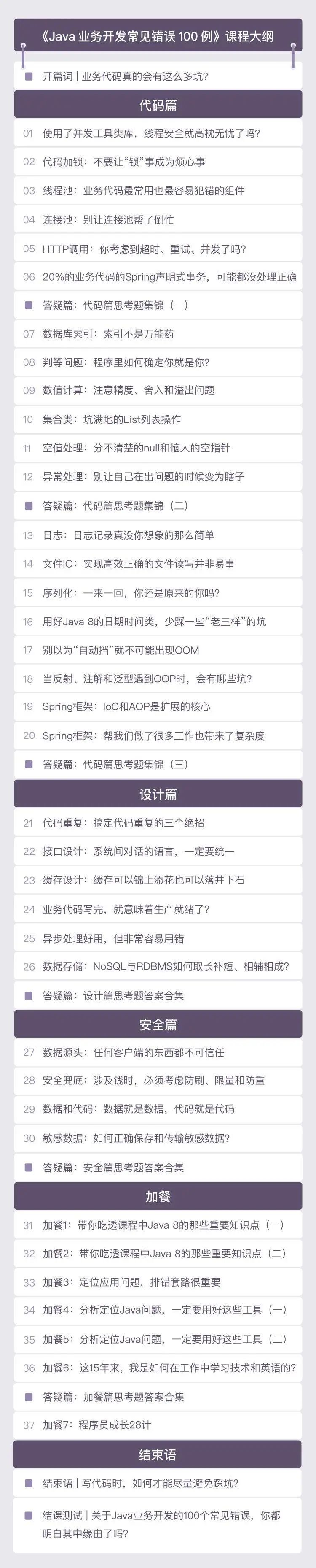 专栏共 46 讲,现已全部更新完毕,每节课都围绕 Java 业务开发的一个核心点,对应 2-5 个案例,结合代码演示,带你掌握规避高频坑点的方法,真正提升解决问题的能力。