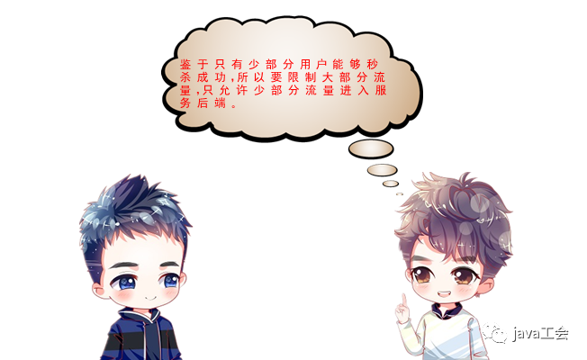 限流:鉴于只有少部分用户能够秒杀成功,所以要限制大部分流量,只允许少部分流量进入服务后端。