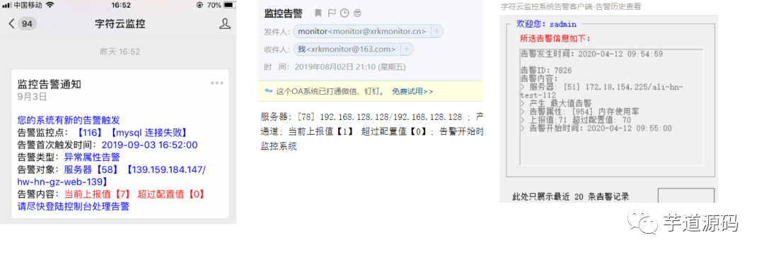 告警集成: 集成告警功能, 支持邮件、短信、微信、PC客户端等告警方式,告警功能无需开发直接可用。