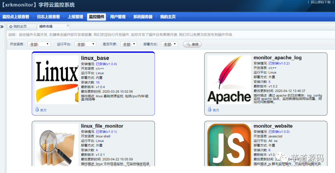 支持插件功能, 监控插件无需开发,自由选择监控插件,安装即可使用