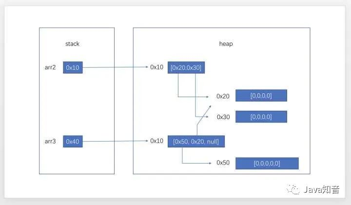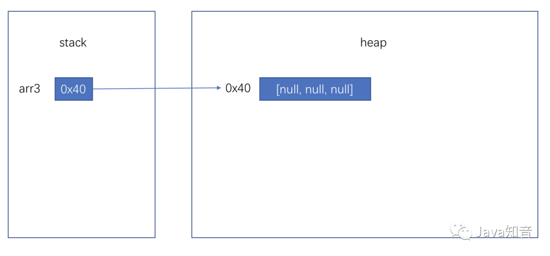 你还可以这样声明:int[][] arr3 = new int[3][],这时内存情况如下图