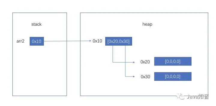 当我们声明一个二维数组时,如 int[][] arr2 = new int[2][4],arr2同样仅在stack中占用4个字节,会在内存中开辟一个长度为2的,类型为int[]的数组,然后arr2指向这个数组。这个数组内部有两个引用(大小为4字节),分别指向两个长度为4的类型为int的数组。