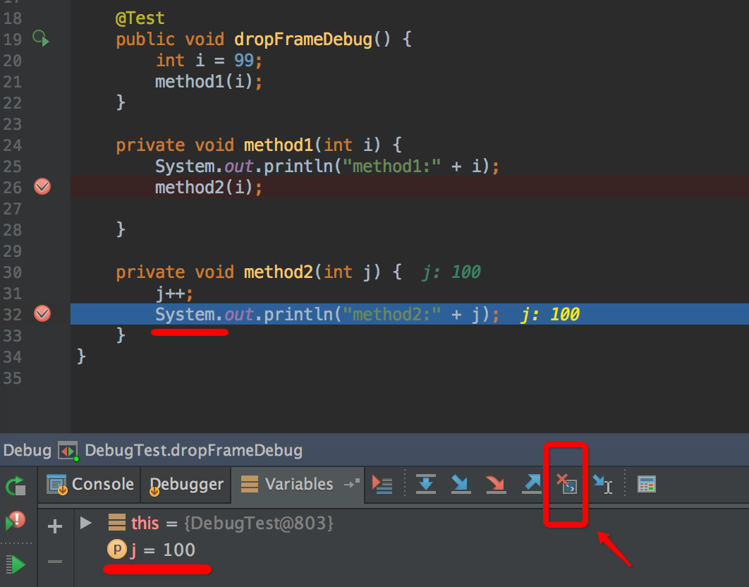 参考上图,method1方法调用method2,当前断点的位置j=100,点击上图红色箭头位置的Drop Frame图标后,时间穿越了