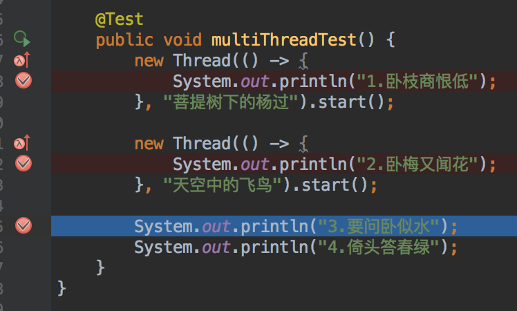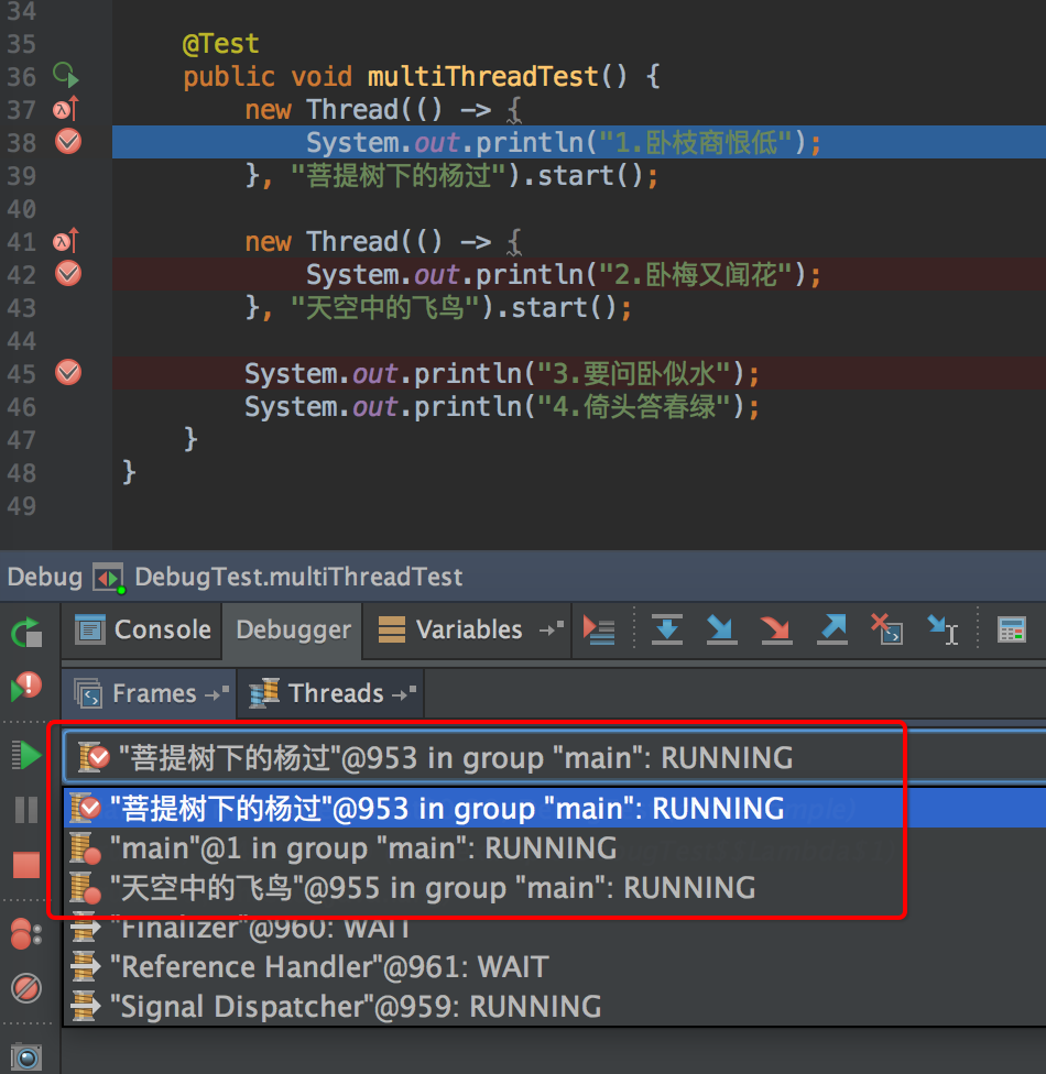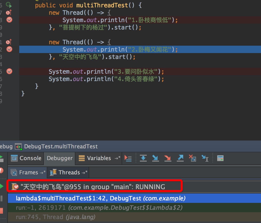 注意上图中的红框位置,断点停下来时,这个下拉框可以看到各个线程(注:给线程起个容易识别的名字是个好习惯!),我们可以选择线程“天空中的飞鸟”