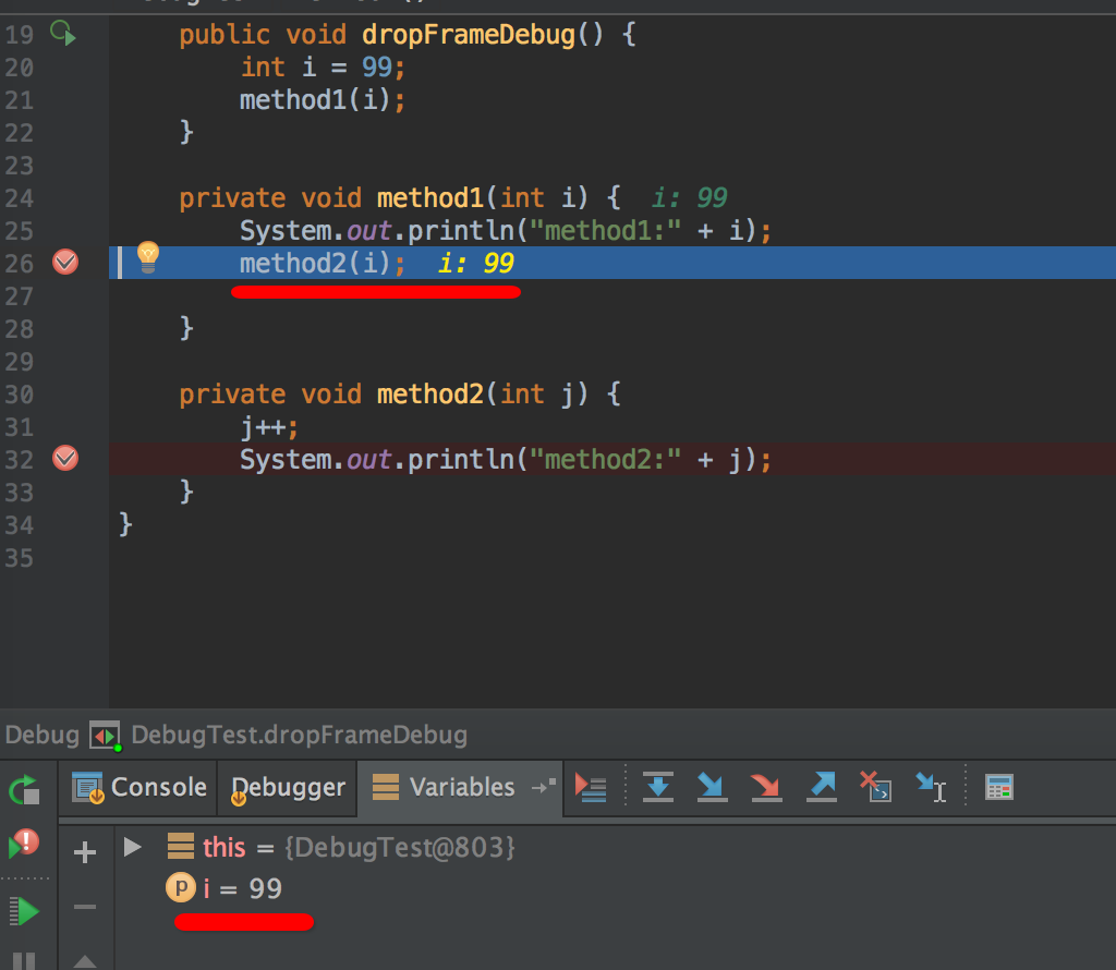 注:好奇心是人类进步的阶梯,如果想知道为啥这个功能叫Drop Frame,而不是类似Back To Previous 之类的,可以去翻翻JVM的书,JVM内部以栈帧为单位保存线程的运行状态,drop frame即扔掉当前运行的栈帧,这样当前“指针”的位置,就自然到了上一帧的位置。
