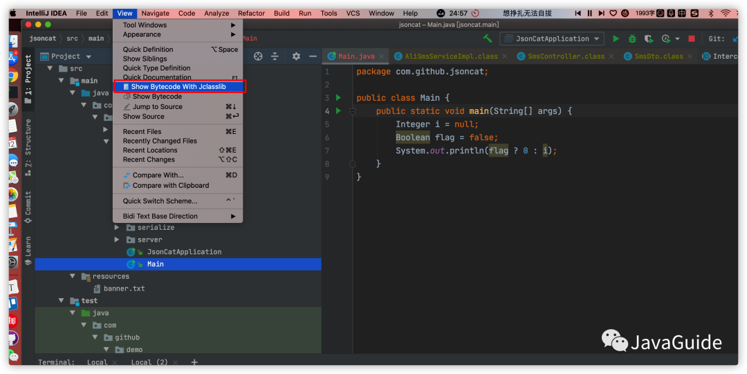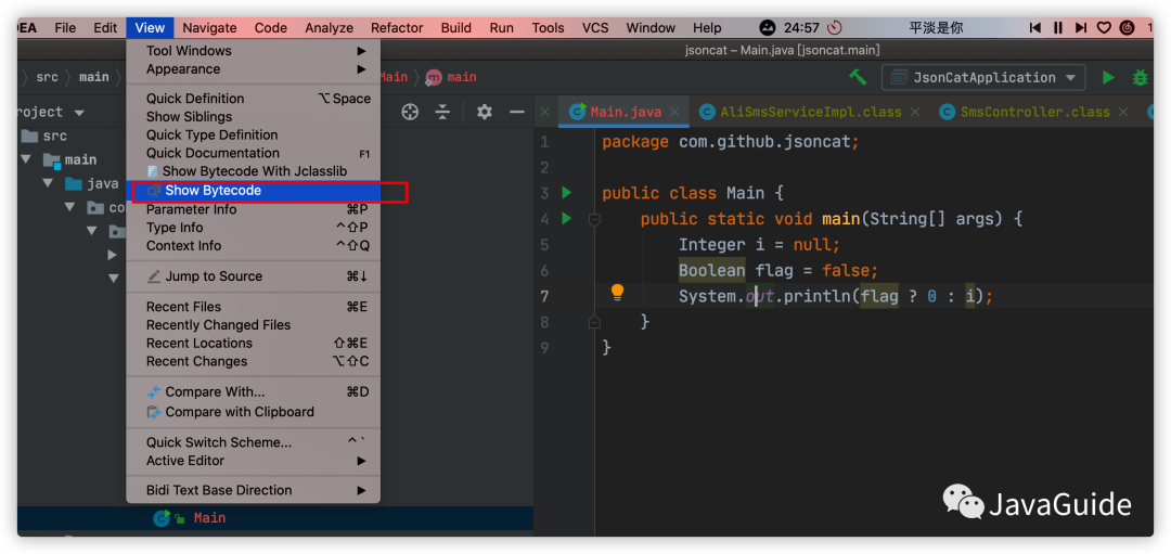 下面介绍两种使用 IDEA 查看类对应字节码文件的方式(javap这种方式就不提了)。
