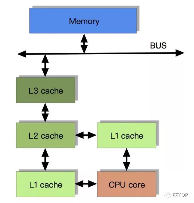 在一个典型系统中,可能会有几个缓存(在多核系统中,每个核心都会有自己的缓存)共享主存总线,每个相应的CPU会发出读写请求,而缓存的目的是为了减少CPU读写共享主存的次数。