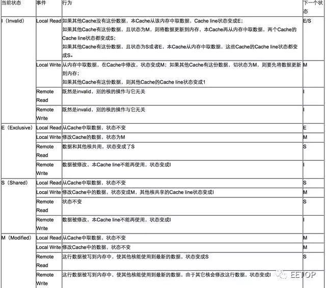 一个处于E状态的缓存行也必须监听其它缓存读主存中该缓存行的操作,一旦有这种操作,该缓存行需要变成S状态。