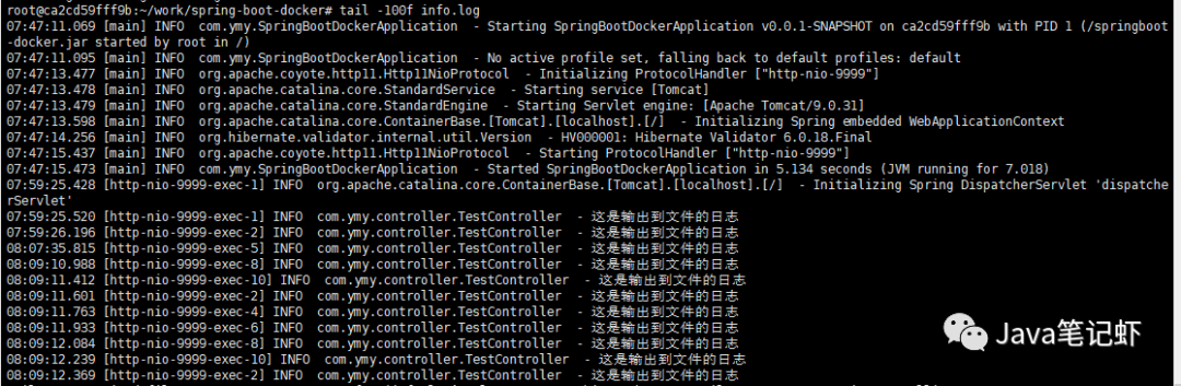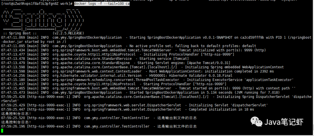 这说明我们已经springboot项目已经启动成功了,到这里docker部署springboot项目差不就结束了,但是你可能还有一个疑问,如果我想看控制台的日志怎么办呢?像我们一般使用java -jar的时候都会生成一个控制台的日志文件,那docker容器中怎么查看控制台日志呢?其实很简单,只需要一行命令即可