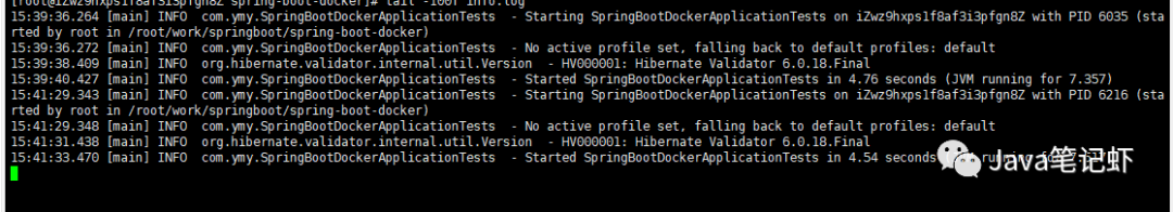 15:29:19.386 [main] INFO com.ymy.SpringBootDockerApplication - Starting SpringBootDockerApplication on LAPTOP-3GLHJRE9 with PID 20652 (D:\springboot\spring-boot-docker\target\classes started by admin in D:\springboot)