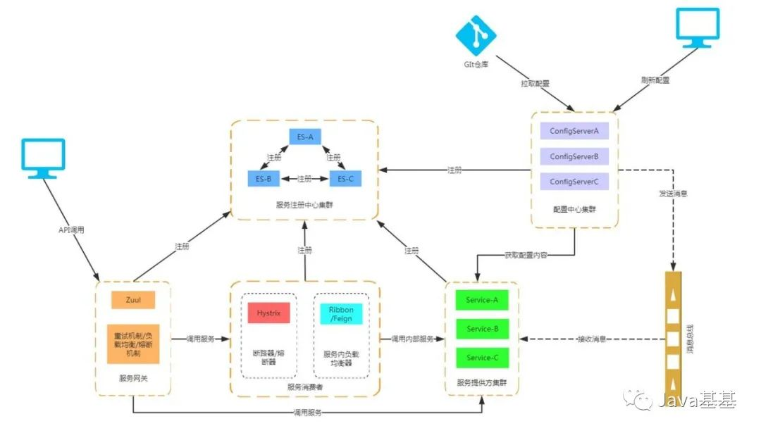 如果你能这个时候能看懂下面那张图,也就说明了你已经对 Spring Cloud 微服务有了一定的架构认识。