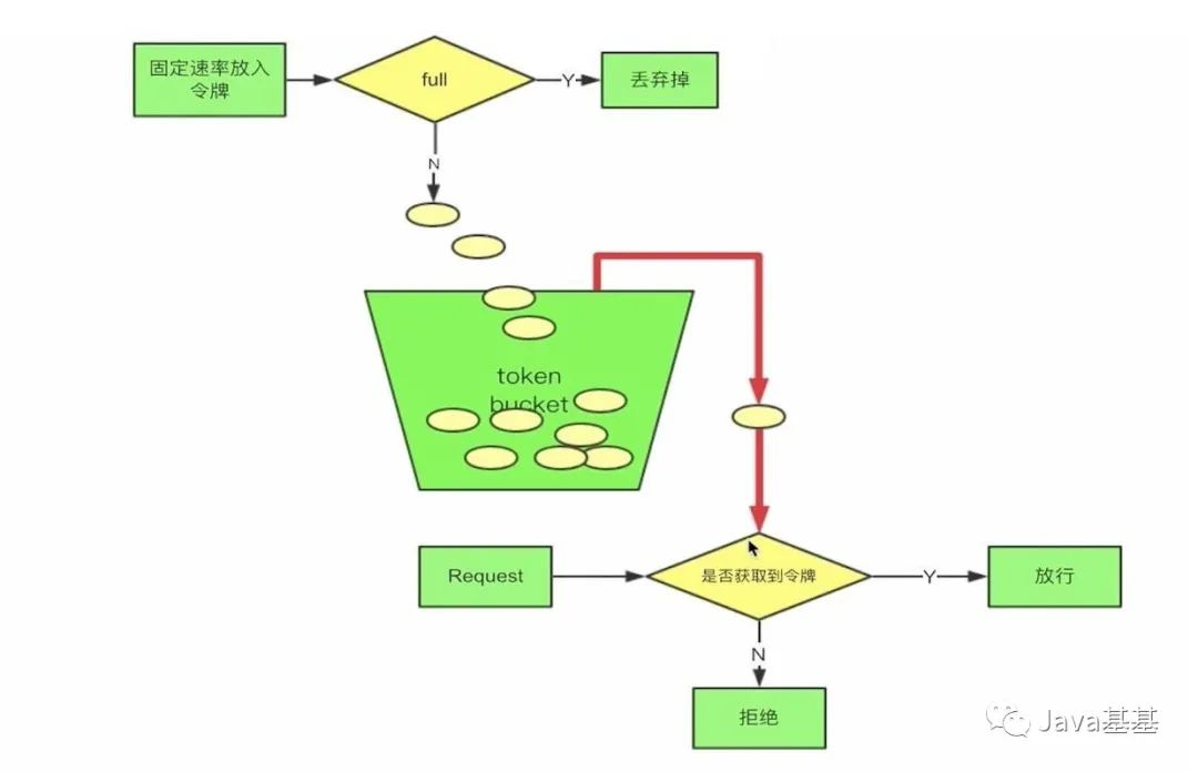 首先我们会有个桶,如果里面没有满那么就会以一定 固定的速率 会往里面放令牌,一个请求过来首先要从桶中获取令牌,如果没有获取到,那么这个请求就拒绝,如果获取到那么就放行。很简单吧,啊哈哈、