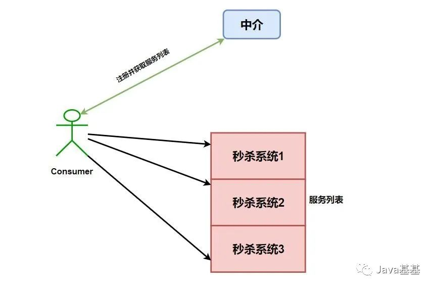 我们再举个????,比如我们设计了一个秒杀系统,但是为了整个系统的 高可用 ,我们需要将这个系统做一个集群,而这个时候我们消费者就可以拥有多个秒杀系统的调用途径了,如下图。