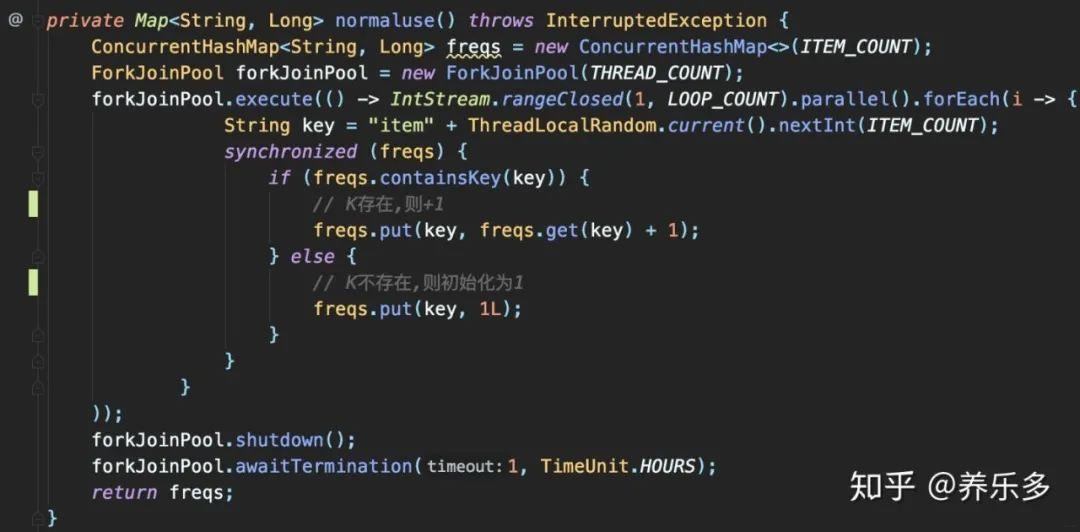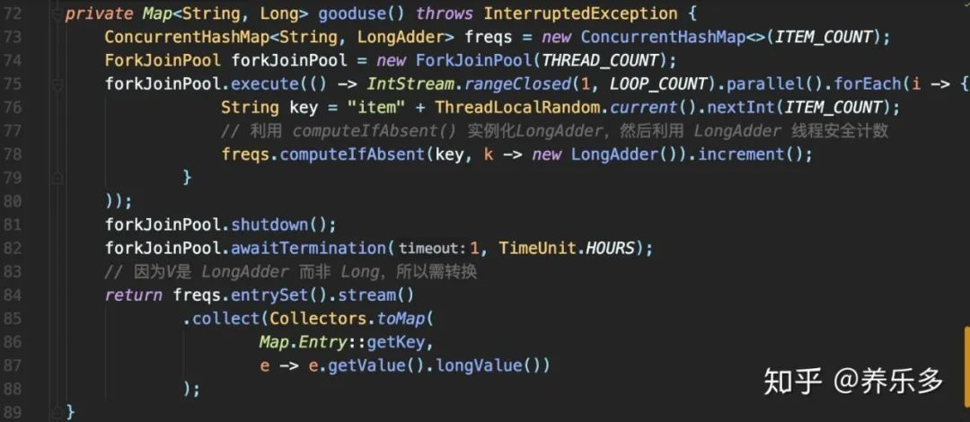 ConcurrentHashMap的原子性方法computeIfAbsent做复合逻辑操作,判断K是否存在V,若不存在,则把Lambda运行后结果存入Map作为V,即新创建一个LongAdder对象,最后返回V 因为computeIfAbsent返回的V是LongAdder,是个线程安全的累加器,可直接调用其increment累加。这样在确保线程安全的情况下达到极致性能,且代码行数骤减。