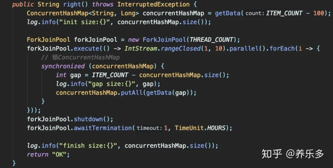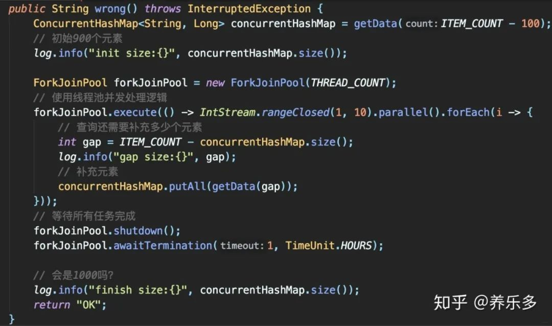 有个含900个元素的Map,现在再补充100个元素进去,这个补充操作由10个线程并发进行。开发人员误以为使用ConcurrentHashMap就不会有线程安全问题,于是不加思索地写出了下面的代码:在每一个线程的代码逻辑中先通过size方法拿到当前元素数量,计算ConcurrentHashMap目前还需要补充多少元素,并在日志中输出了这个值,然后通过putAll方法把缺少的元素添加进去。