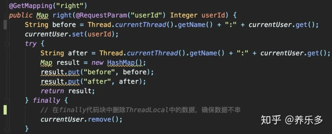 在finally代码块显式清除ThreadLocal中数据。即使新请求过来,使用了之前的线程,也不会获取到错误的用户信息。修正后代码: