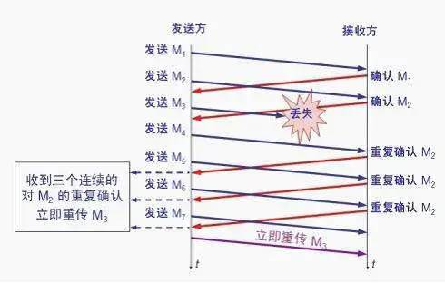 接收方收到了M1和M2后都分别发出了确认。现在假定接收方没有收到M3但接着收到了M4。