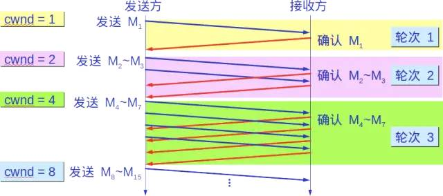 每经过一个传输轮次,拥塞窗口 cwnd 就加倍。**一个传输轮次所经历的时间其实就是往返时间RTT。**不过“传输轮次”更加强调:把拥塞窗口cwnd所允许发送的报文段都连续发送出去,并收到了对已发送的最后一个字节的确认。