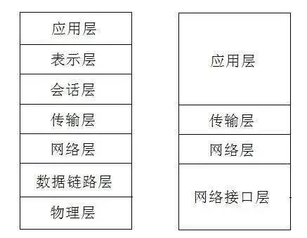 基于TCP/IP的参考模型将协议分成四个层次,它们分别是链路层、网络层、传输层和应用层。下图表示TCP/IP模型与OSI模型各层的对照关系。