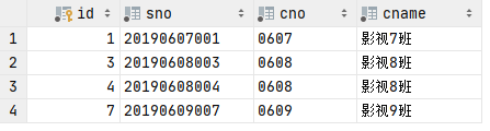 INSERT INTO tbl_student_class(sno, cno, cname) VALUES ('20190608004', '0608', '影视8班');