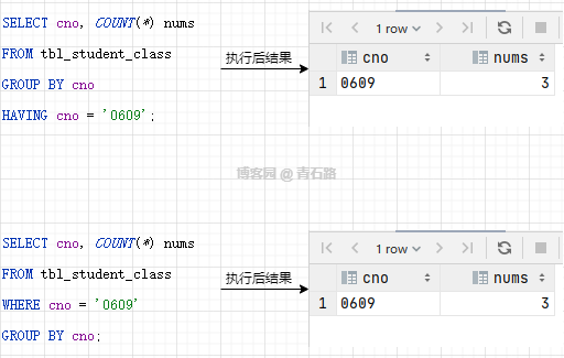 虽然条件分别写在 HAVING 子句和 WHERE 子句当中,但是条件的内容,以及返回的结果都完全相同,因此,很多小伙伴就会觉得两种书写方式都没问题
