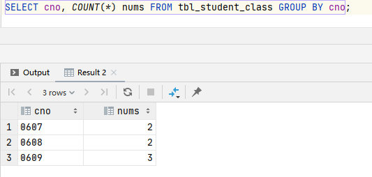 SELECT cno, COUNT(*) nums FROM tbl_student_class GROUP BY cno HAVING COUNT(*) = 3;