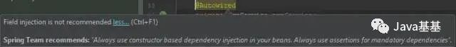 基于字段的依赖注入方式会在Idea当中吃到黄牌警告,但是这种使用方式使用的也最广泛,因为简洁方便.您甚至可以在一些Spring指南中看到这种注入方法,尽管在文档中不建议这样做.(有点执法犯法的感觉)