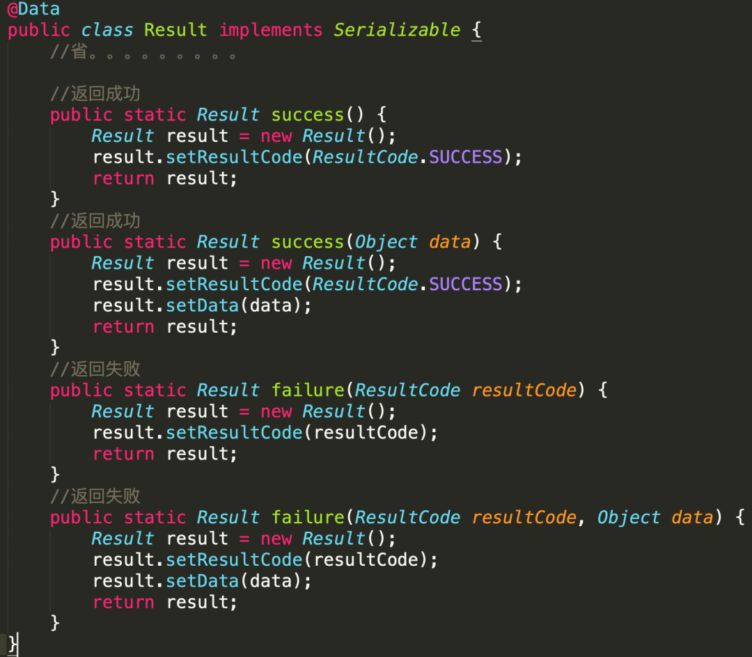 上面我们看到在Result类中增加了静态方法,使得业务处理代码简洁了。但小伙伴们有没有发现这样有几个问题: