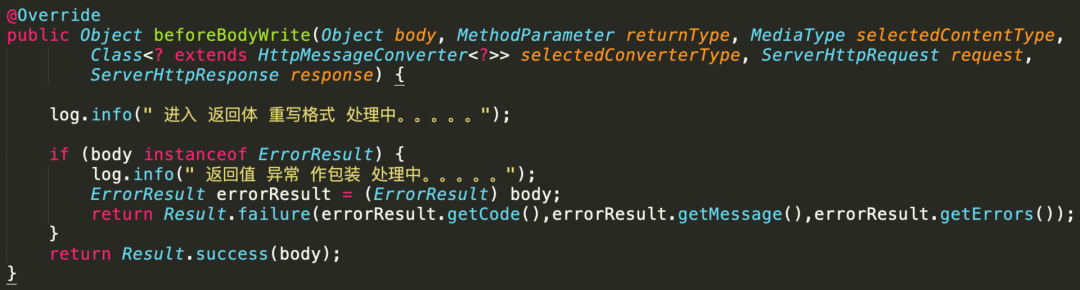 上面代码就是判断是否需要返回值包装,如果需要就直接包装。这里我们只处理了正常成功的包装,如果方法体报异常怎么办?处理异常也比较简单,只要判断body是否为异常类。