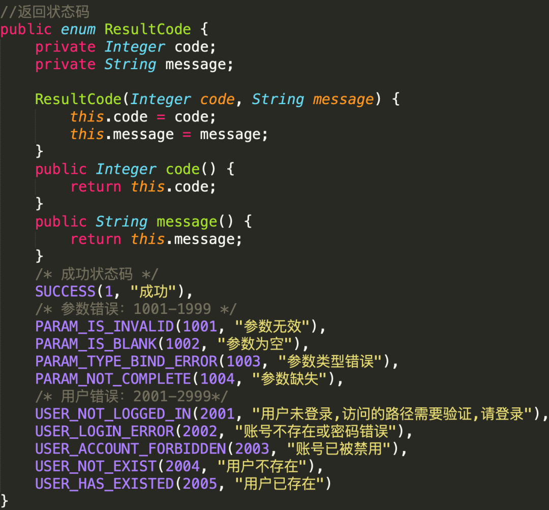 这样前端开发人员在得到返回值后,根据状态码就可以知道,大概什么错误,再根据message相关的信息描述,可以快速定位。