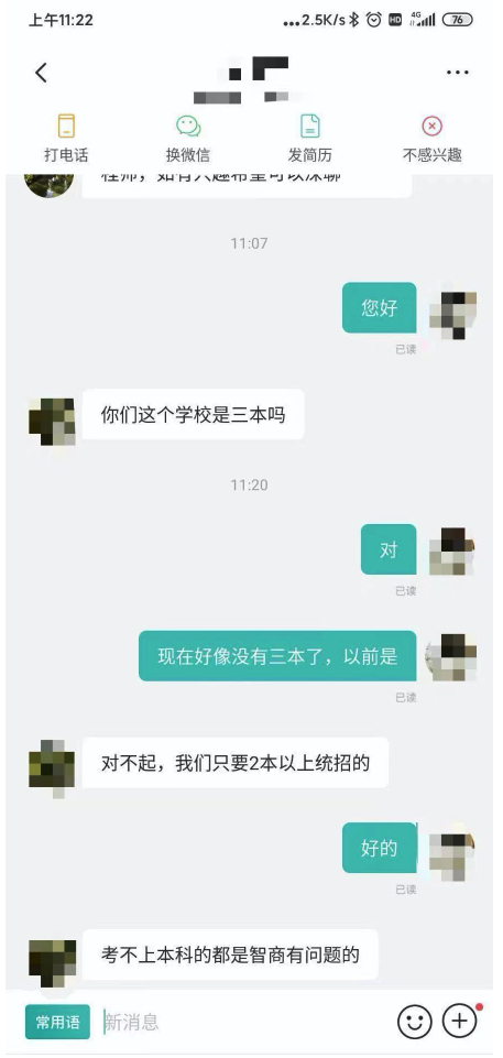这件事情到这好像还没完,他说:考不上本科的都是智商有问题的,从这句话看出他好像鄙视的是非本科同学,那人家是本科啊,难道三本不算是本科吗?好好笑啊。