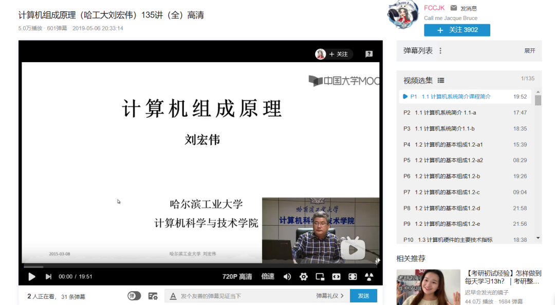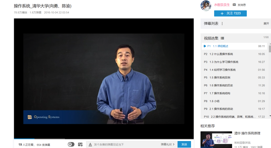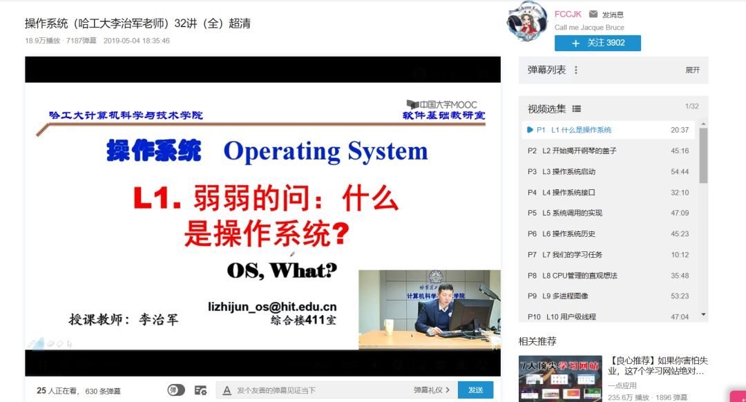 整体看了一遍,个人觉得是 b 站上很不错的操作系统课程了(经典课程如 mit6.828 在 b 站上的似乎都没有字幕而且拍摄角度实数刁钻)。这门课的前几讲涉及 OS 启动(老师谜之口糊),需要一点汇编知识,不过遇到不会的直接网上搜即可,大可不必因为汇编而被劝退;之后的内容如多进程、信号量、内存管理等讲得很好,不做赘述。如果对这部分有不解的地方可以网上搜资料或者去看 b 站上新竹清华大学的 OS 课程最后在学这门课前建议对计算机有个整体认识,可以去学习一下经典的 csapp 或者 mit6.004(对应国内的计组,一个偏软件,一个偏硬件)