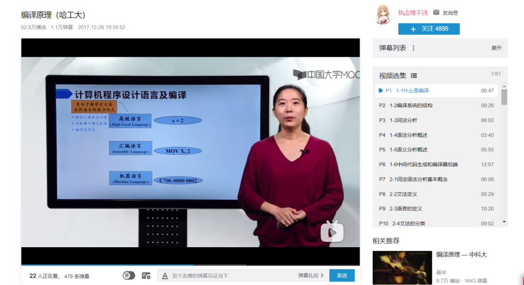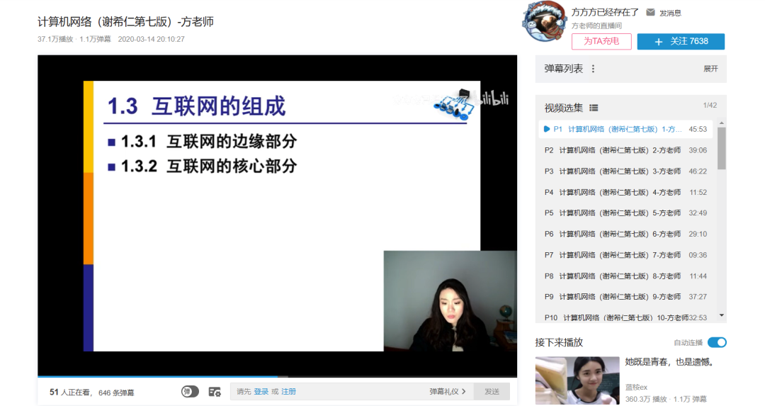 在计算机网络方面,我还想推荐的一位老师就是方老师,也是一位小姐姐老师。她的视频配套的教材也是谢老师的网络教材,在线看的小伙伴也超多,弹幕都是对方老师的评价。