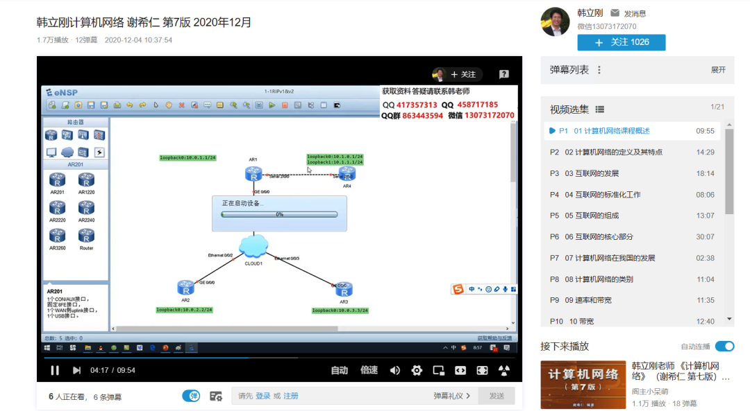 韩立刚老师所讲的计算机网络视频,内容比较多,但是讲解的通俗易懂,并且老师讲课的经验也十分的丰富。配套的教材是谢希仁老师的计算机网络教材,韩老师的最近的一个视频视频比较新,播放量还比较少,但是他讲的是真的不错,相比于王道考研所讲的计算机网络,韩老师更加细致一些。