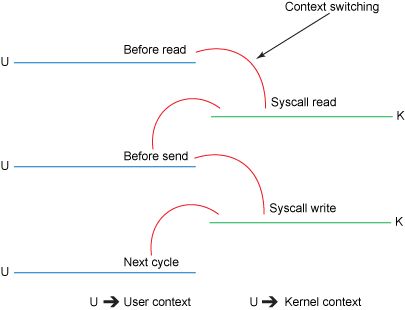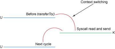 在此模型下,上下文切换的数量减少到一个。具体而言,transferTo()方法指示块设备通过 DMA 引擎将数据读取到读取缓冲区中。然后,将该缓冲区复制到另一个内核缓冲区以暂存到套接字。最后,套接字缓冲区通过 DMA 复制到 NIC 缓冲区。