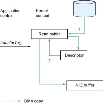 根据前面的示例,调用transferTo()方法会使设备通过 DMA 引擎将数据读取到内核读取缓冲区中。但是,使用gather操作时,读取缓冲区和套接字缓冲区之间没有复制。取而代之的是,给 NIC 一个指向读取缓冲区的指针以及偏移量和长度,该偏移量和长度由 DMA 清除。CPU 绝对不参与复制缓冲区。