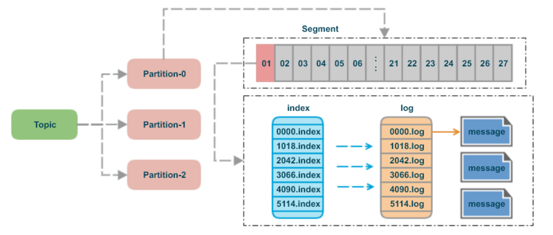 segment file 组成:由 2 大部分组成,分别为 index file 和 data file,此 2 个文件一一对应,成对出现,后缀”.index”和“.log”分别表示为 segment 索引文件、数据文件。