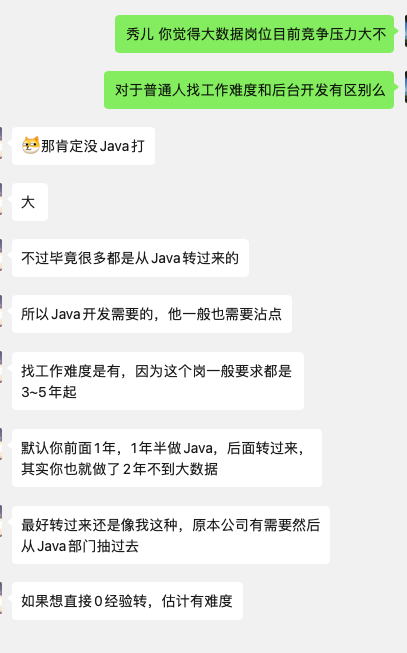 下面是我与一位 Java 后台开发转大数据岗位的朋友的聊天: