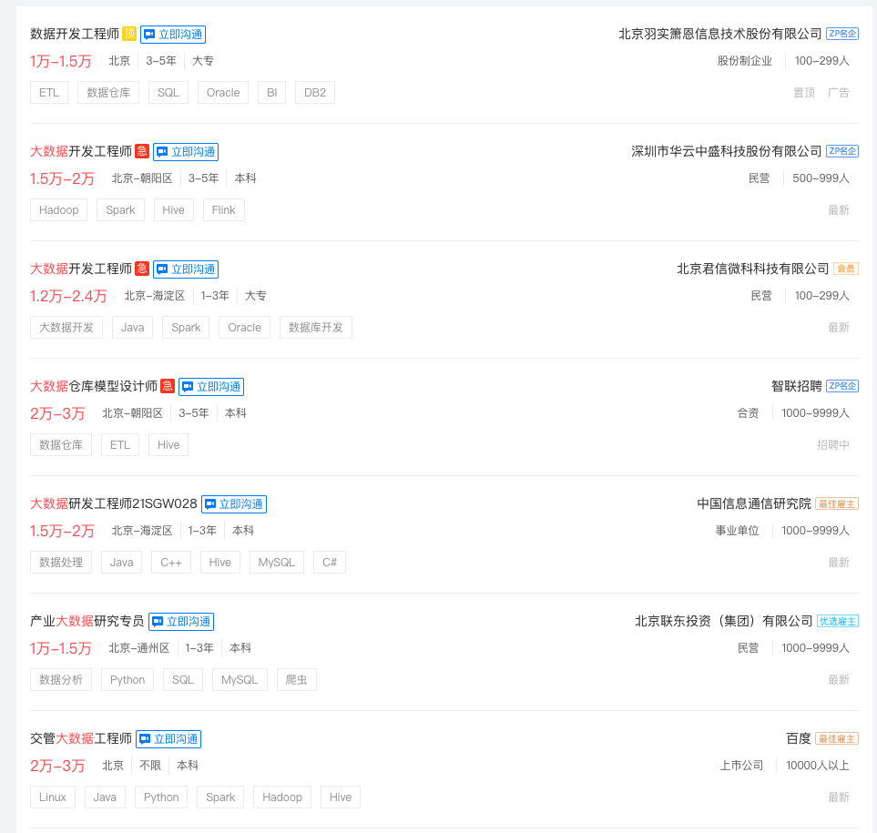 另外,如果你的简历上写了你会 Spring 这些东西的话,面试官应该也会一并提问。不过,现在的大数据岗位一般没有强制性要求你有 web 开发经验,在我那一年找工作的时候,大部分大数据开发岗位都要求你还要有 web 开发经验。而且,这个岗一般要求都是 3~5 年起。